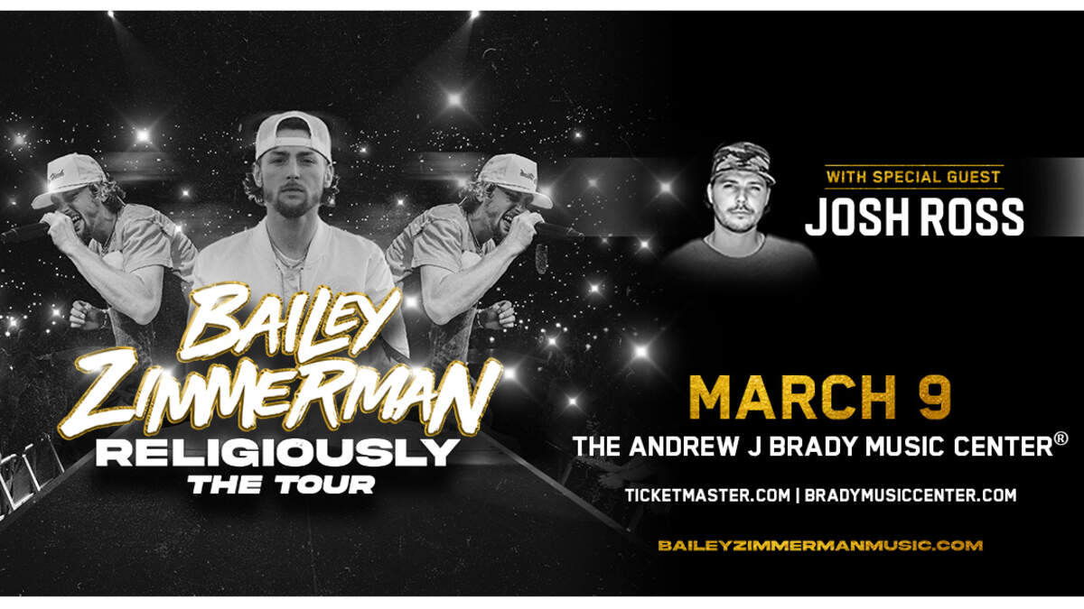 Bailey Zimmerman: RELIGIOUSLY. THE TOUR. Sat • Mar 09, 2024 • 7:30 PM The Andrew J Brady Music Center, Cincinnati, OH