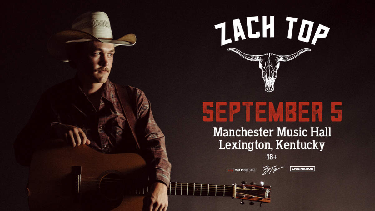 Zach Top at Manchester Music Hall (Lexington) date: 9/5/2024 | showtime: 8:00 PM Event link: https://www.ticketweb.com/event/zach-top-manchester-music-hall-tickets/13530294