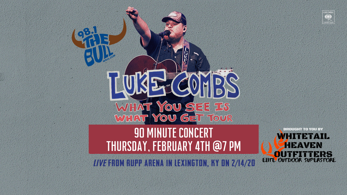 Join 98.1 The Bull on Thursday, February 4th as we air a 90 minute special performance of Luke Combs’ Live from Rupp Arena featuring his last show on February 14, 2020! This Luke Combs station takeover is your own private house party thanks to 98.1 The Bull and Whitetail Heaven Outfitters Elite Outdoor Superstore! Light the fireplace, light a candle, grab a drink and join the fun.