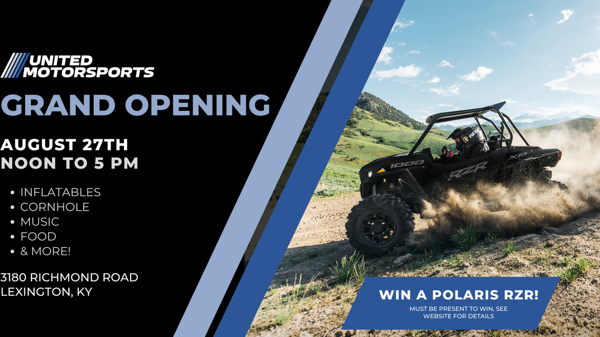 Join us at our Grand Opening event on Saturday, August 27th, from noon to 5 for music, food, and fun for the whole family! Plus, you can enter to win a Polaris RZR and other fabulous giveaways. Come and explore our showroom, bounce in inflatables, or play some cornhole and see what United Motorsports is all about.